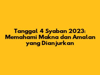 Tanggal 4 Syaban 2023 adalah hari yang istimewa dalam kalender Hijriyah. Meskipun tidak ada amalan khusus yang hanya dilakukan pada tanggal tersebut, kita tetap bisa meningkatkan ibadah dan melakukan amalan-amalan yang dianjurkan di bulan Syaban secara umum. Manfaatkan momentum ini untuk melakukan introspeksi diri, memperbaiki kekurangan-kekurangan yang ada, dan meningkatkan kualitas ibadah kita. Dengan begitu, kita akan lebih siap menyambut bulan Ramadan yang penuh berkah.